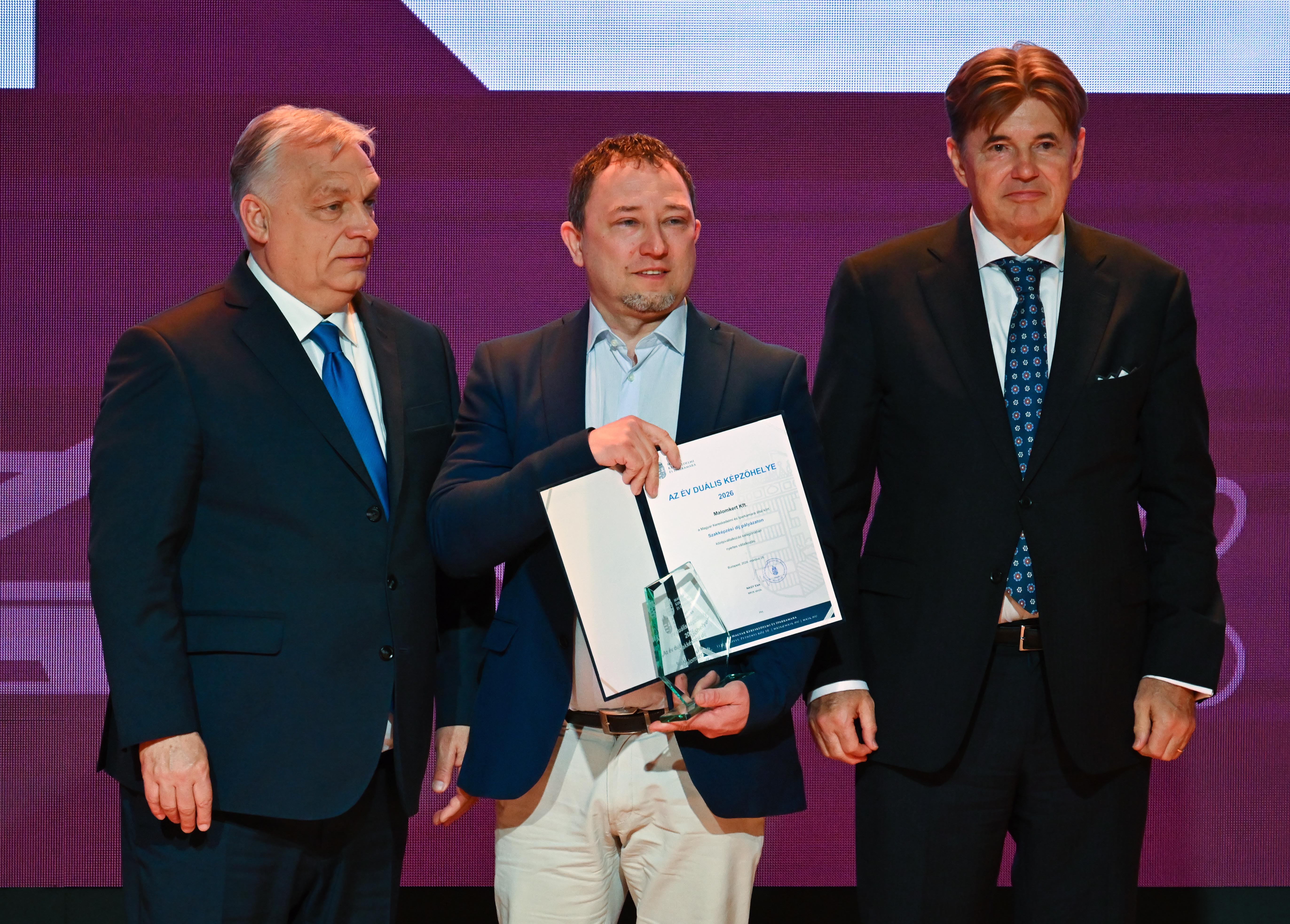 A tatai Öreg-tó partján található vendéglátóhelyet és hotelt üzemeltető Malomkert Kft. kapta meg „Az év duális képzőhelye-2026” pályázat első díját közepes vállalkozás kategóriában. Az elismerést Orbán Viktor miniszterelnöktől vehette át Pálházy Nándor operatív igazgató az idei Szakma Sztár Fesztivál nyitóünnepségén.